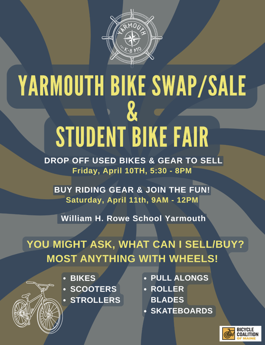 We'll be joined by the Bicycle Coalition of Maine and the Yarmouth Bike and Pedestrian Committee and there will be lots of activities going on. Even if you're not looking for a new bike or new gear, take the opportunity to dust off your riding legs with a ride to Rowe and then pick up a delicious snack at the best-ever Bake Sale, take a lap in the Bike Rodeo, or bling out your bike!