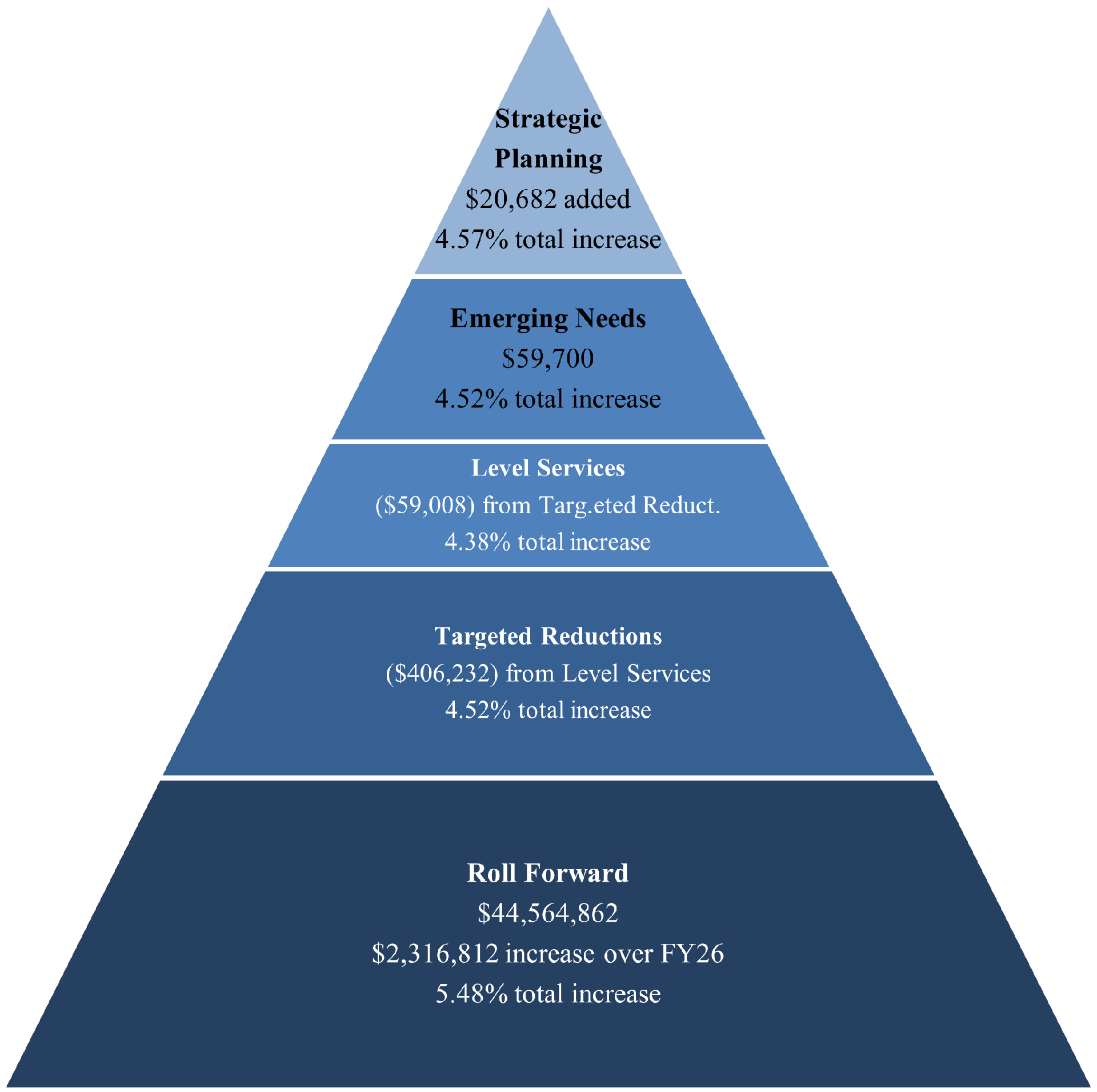 We want to thank all of you who have been participating in or observing the Budget Workshops. Superintendent Dolloff has presented a budget to the School Committee with a 4.57% increase over the current year. As shown above in the "budget pyramid," a "roll forward" budget would result in a larger increase than is being proposed, as the district's leadership team has worked diligently to ensure the budget is right-sized for the school population and needs. To read more about the proposed budget, please view the district's Finance Page. Remaining meetings in the public review process include: