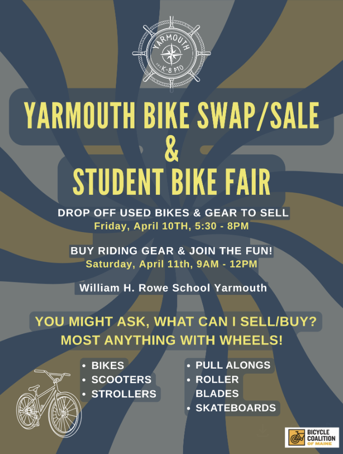 We'll be joined by the Bicycle Coalition of Maine and the Yarmouth Bike and Pedestrian Committee and there will be lots of activities going on. Even if you're not looking for a new bike or new gear, take the opportunity to dust off your riding legs with a ride to Rowe and then pick up a delicious snack at the best-ever Bake Sale, take a lap in the Bike Rodeo, or bling out your bike!
