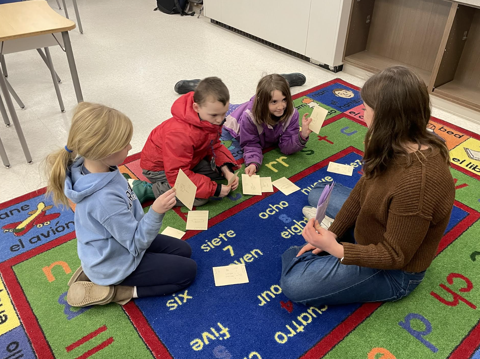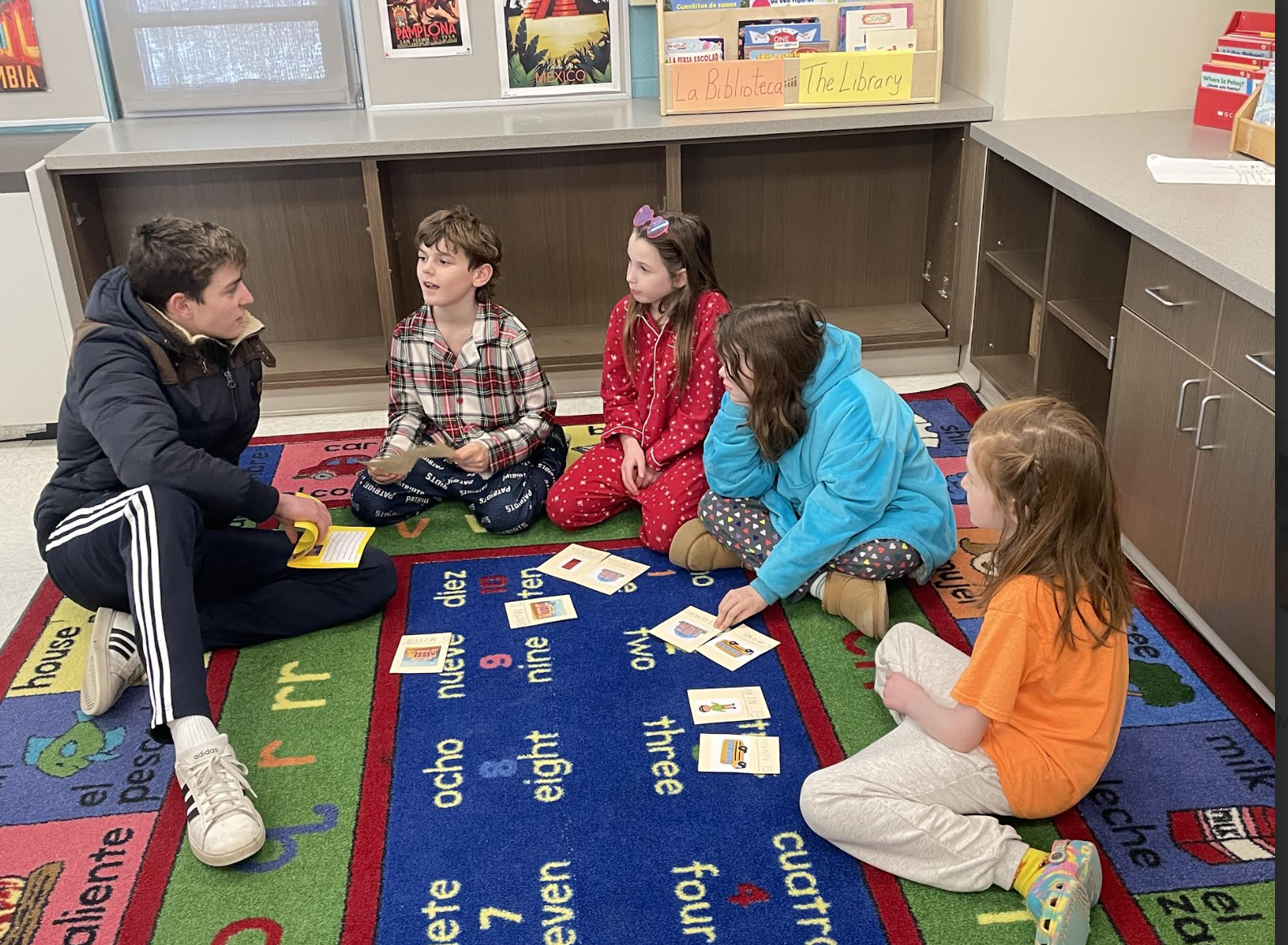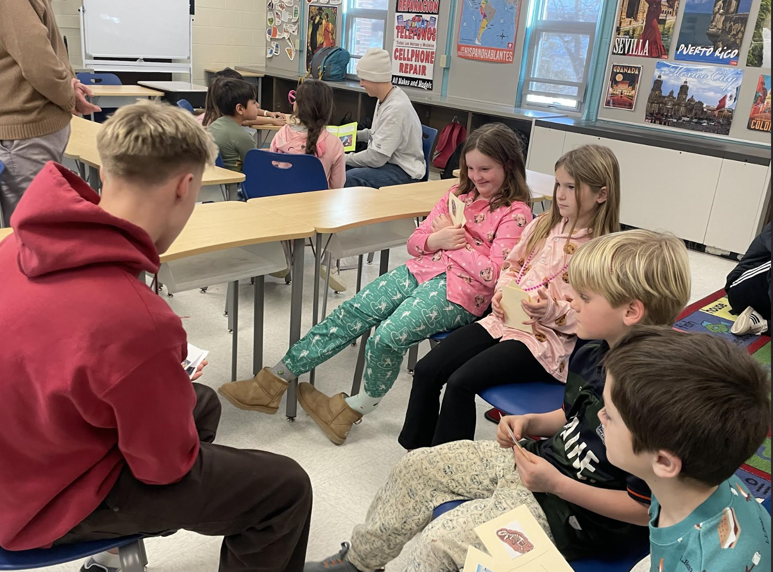 Our second graders continue to practice simple sentence formation. In the past months we have focused on food, body parts and wild animals for vocabulary. Second graders have been beginning each class by practicing the time and talking about the day's weather. Third graders have begun to learn verbs and how they are necessary to form a sentence. There are twenty-five common verbs that we are presently learning and which will be expanded on in the future. We enjoyed a visit from our high school Spanish students who came down to YES to read and do activities with our third grade learners! Check out the pictures of their visit below.